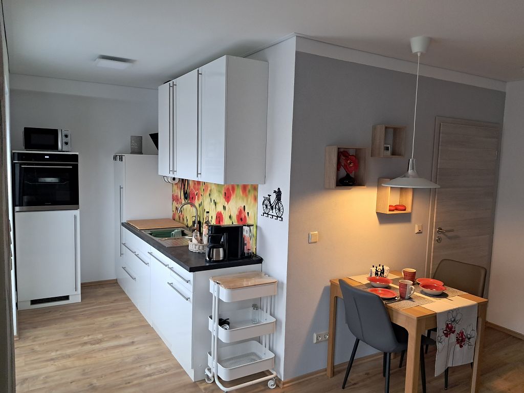 Ein besonderes Highlight unserer Ferienwohnung ist die durchgängige Stufenfreiheit. Sie können sich auf eine vollständig ausgestattete Küche freuen, die Ihnen sämtliche Annehmlichkeiten bietet, um auch im Urlaub selbstständig zu arbeiten und Ihre Lieblingsgerichte zu zaubern. Ob Sie ein schnelles Frühstück oder ein romantisches Abendessen planen – hier finden Sie alles, was Sie brauchen.